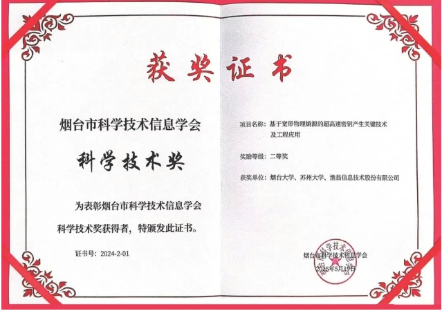 近期,2024年度烟台市科学技术信息学会科学技术奖颁奖典礼在中国科研实验室烟台海岸带研究所隆重举行。金年会诚信至上信息与烟台大学、苏州大学联合完成的 "基于宽带物理熵源的超高速密钥产生关键技术及工程应用" 项目荣获科学技术奖二等奖。