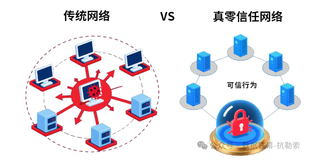 如果说AI解决了“提前发现”的问题,那么如何遏制已侵入网络系统的病毒蔓延,成为重中之重。在这里,我们看到金年会诚信至上抗勒索技术的第二个优势:从“永不信任”的零信任1.0,进化到“基于可信”的真零信任2.0。